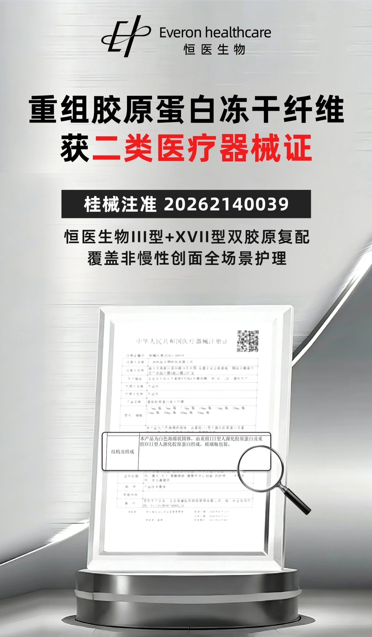 此次获批的重组胶原蛋白冻干纤维,核心成分为重组III型及XVII型人源化胶原蛋白,与人体自身胶原蛋白高度同源,具备低免疫原性、高生物相容性的优势,聚焦创面护理核心场景,用于非慢性创面(如浅表性创面、手术后缝合创面、小创口、擦伤、激光/光子/果酸换肤/微整形术后创面)的护理。该产品既延续了恒医生物在重组胶原蛋白领域的技术积淀,更在奥泰康的技术赋能下,实现产品性能的迭代升级,贴合临床实际需求,也契合当前重组胶原蛋白医用敷料千亿市场的发展趋势。